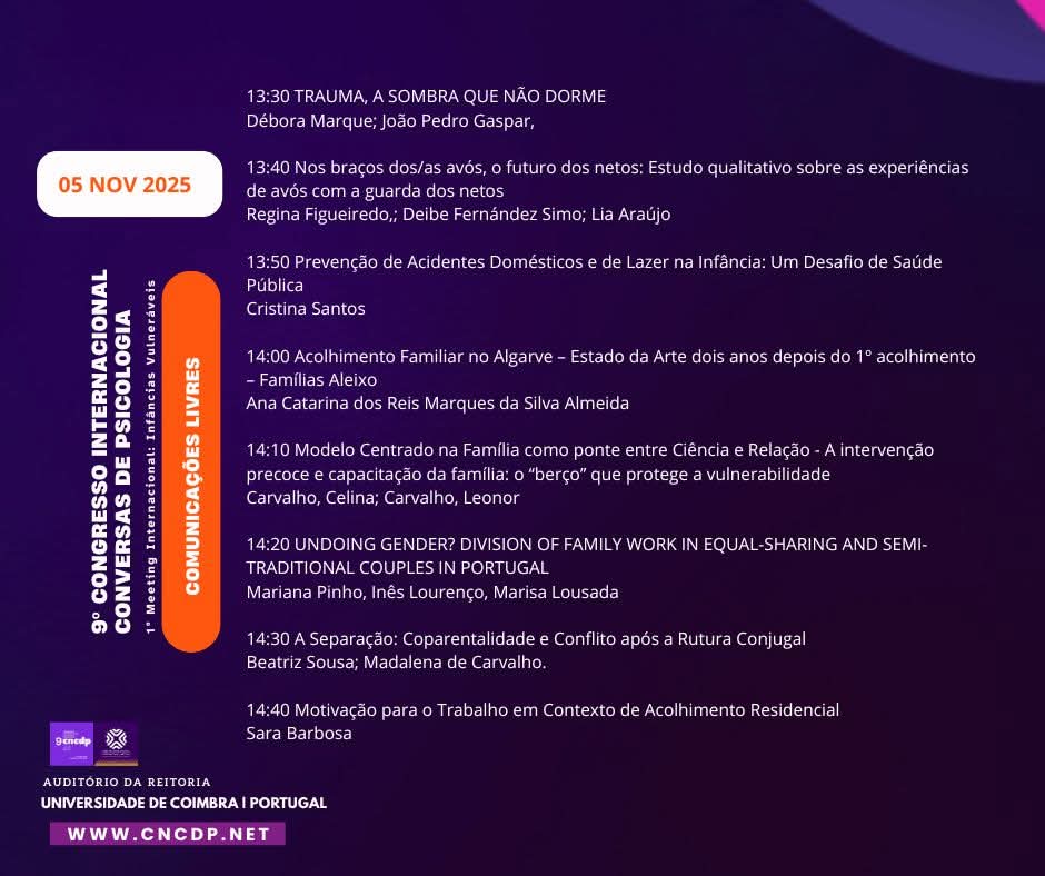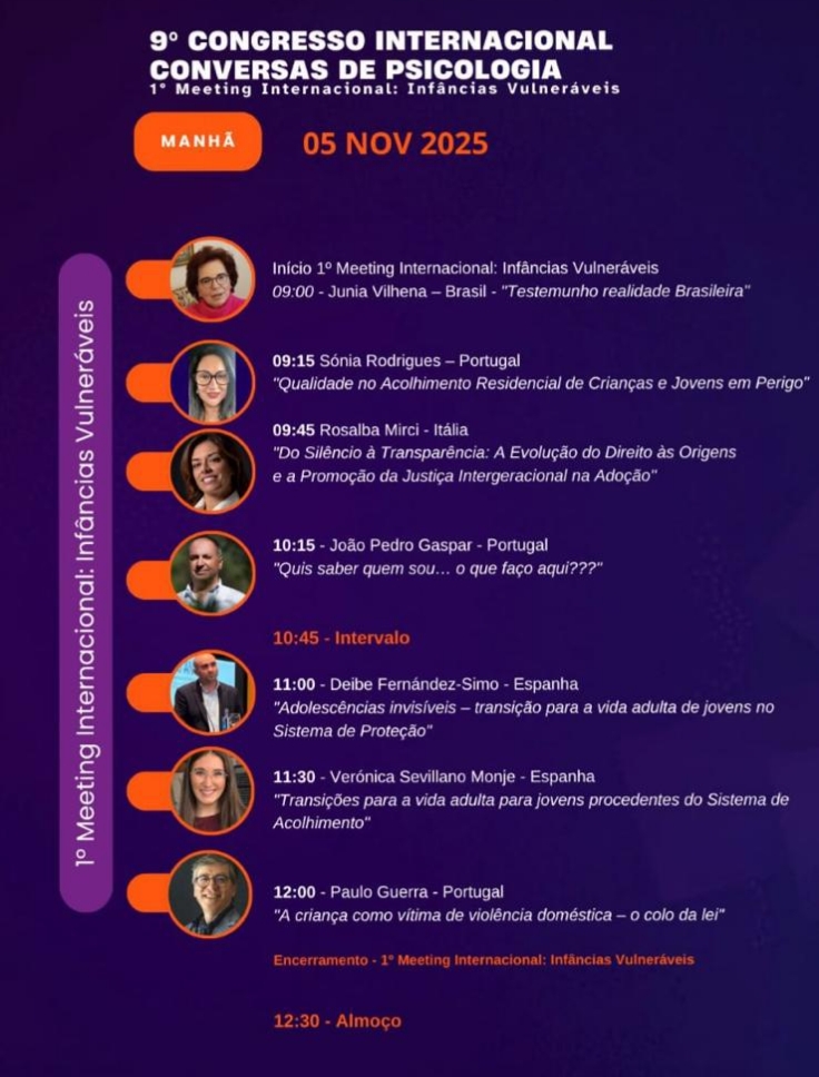 Integrado no programa do 9º Congresso Internacional Conversas de Psicologia, será realizado o 1º Meeting Internacional: Infâncias vulneráveis contará com intervenientes de 4 países, abordando temas transversais à infância. Sabemos que o que se passa na infância não fica na infância, por isso teremos um painel que integra docentes, juízes, psicólogos, mentores de projetos internacionais, com muito saber de experiência feito, capazes de nos catapultarem para um mundo que sabe que “as crianças são as mensagens vivas que enviamos para um tempo que não veremos” Neil Postman»