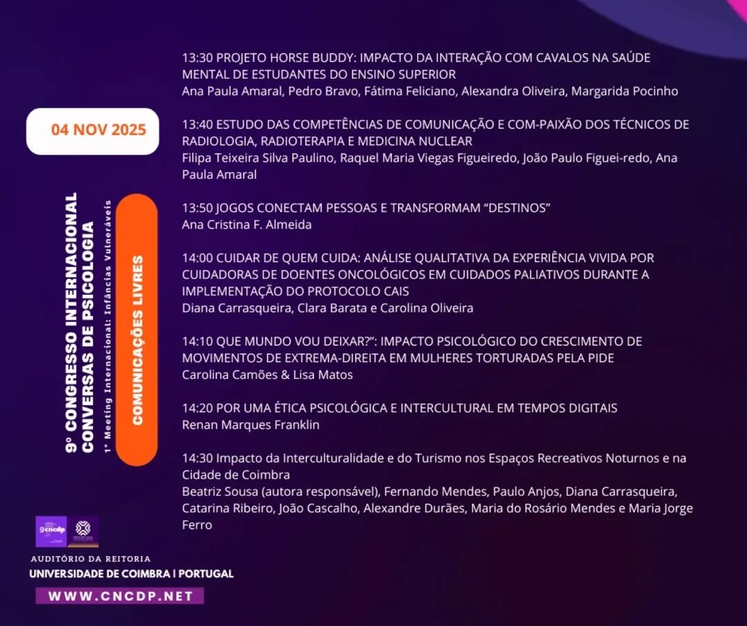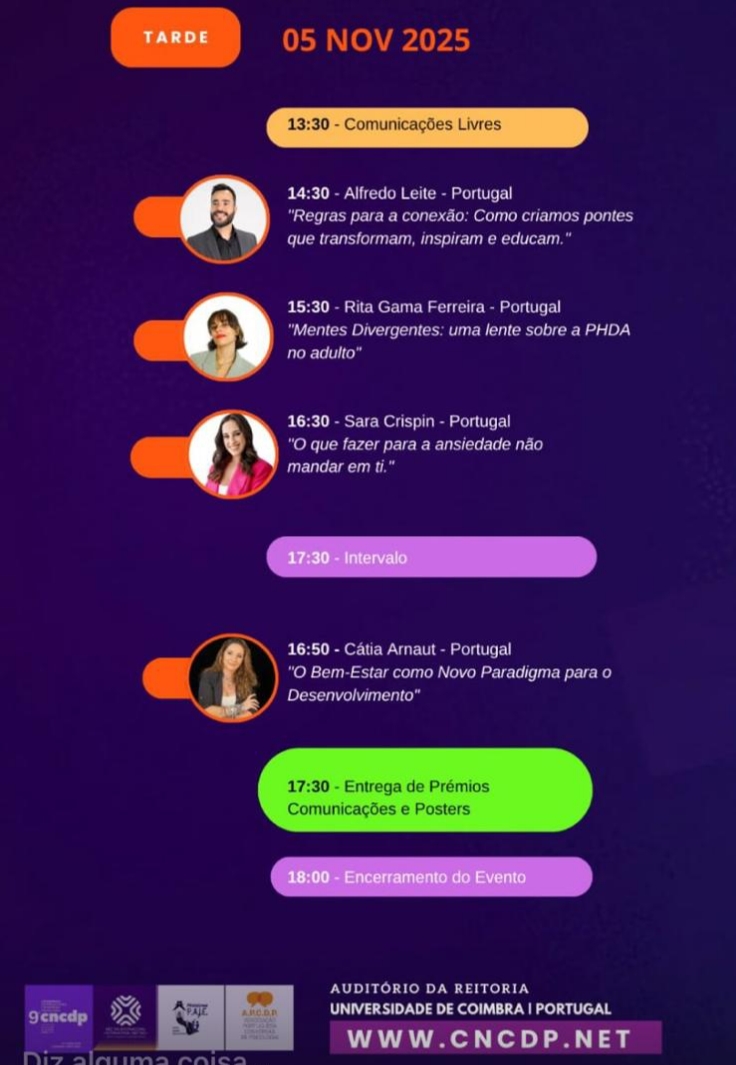 Tal como nas edições anteriores, este ano realizamos o 9.º Congresso Internacional Conversas de Psicologia — um encontro de referência que reúne destacados especialistas, académicos e profissionais da psicologia e das ciências sociais assim como estudantes e publico com interesse na temática.